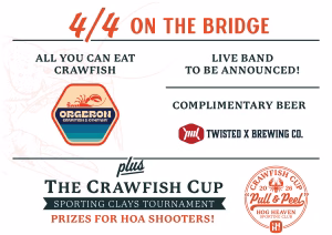 Our next member’s dinner on the bridge is set—and this one is going to be a blast! We’re boiling over 400 lbs of crawfish, with free beer and a rockin’ band. Bring the whole family and invite some friends, you won’t want to miss out on our second annual crawfish event!