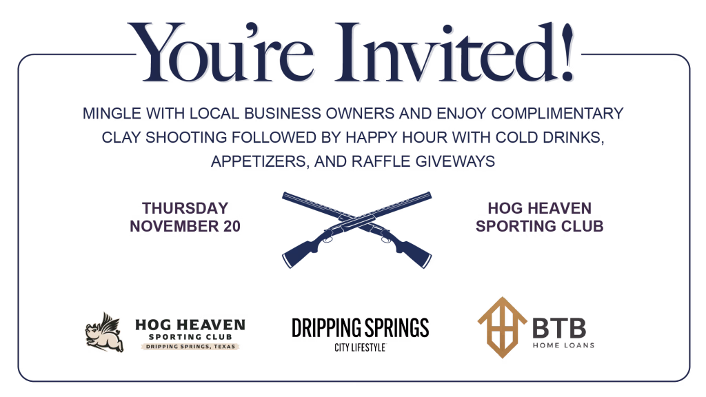 We’re hosting a casual networking event for all local business professionals at Hog Heaven Sporting Club. We’ve lined up a fun afternoon of clay shooting, cold drinks, and appetizers, plus raffle giveaways and tours of the club. Whether you’re in construction, realty, finance, or the outdoor industry, this is the perfect opportunity to meet like-minded professionals and enjoy an afternoon at the Hill Country’s premier sporting club.