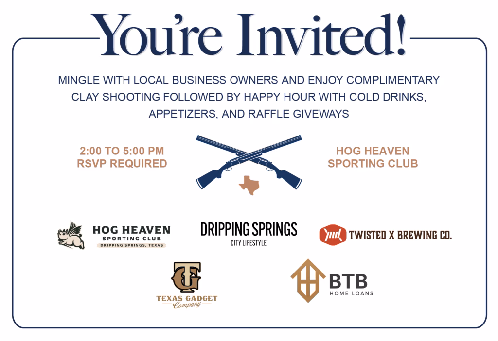 We’re hosting a casual networking event for all local business professionals at Hog Heaven Sporting Club. We’ve lined up a fun afternoon of clay shooting, cold drinks, and appetizers, plus raffle giveaways and tours of the club. Whether you’re in construction, realty, finance, or the outdoor industry, this is the perfect opportunity to meet like-minded professionals and enjoy an afternoon at the Hill Country’s premier sporting club.